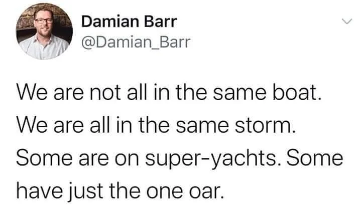 …keeps finding its way back to me. I tweeted it out in April last year then Peggy Noonan picked it up for her column in the Wall Street Journal and from there it’s gone around the world. It’s been featured in in hundreds of newspapers and magazines and memes. It’s strange how a casual thought has become part of a global conversation. Oprah cited it on her SuperSoul Podcast last year and, most surreally, I’ve had people quote it back to me not realizing I said it. For me, that shows how far spread inequality—the yachts and rowing boats, the haves and have-nots. Even more importantly, the sharing of thought and the way folk are adapting it signals a wider desire to challenge inequality and make the world a fairer place.